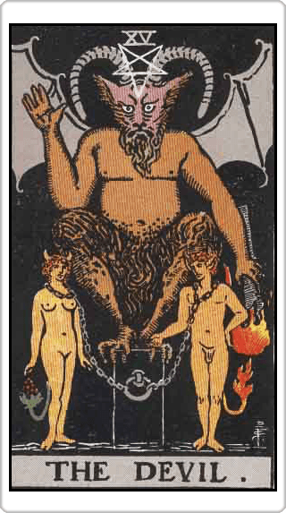 ไพ่ใบนี้เป็นไพ่ที่ใครๆเห็นก็จะแปลไม่ค่อยดีนัก อาจเพราะตัวไพ่เป็นปีศาจที่ใครๆค่อนข้างเกรงกลัว แต่จริงๆแล้วไพ่ใบนี้หมายถึง ความหลงใหล การยึดติด ความงมงาย อาจเป็นได้ทั้งน้อยและมาก อาจหมายถึงว่าเราจดจ่อกับสิ่งใดสิ่งนึงมากๆ เช่น ติดซีรีย์ละคร ติดแฟน ติดเพื่อน ติดการเล่นกีฬา ก็เป็นได้ ซึ่งแน่นอนว่าการที่เราติดอะไรเยอะๆ ย่อมส่งผลเสียต่อเราในบางมุม เช่น เสียสุขภาพกาย สุขภาพจิต ไพ่ใบนี้อาจหมายถึงกรรมที่เราได้ก่อไว้ ที่มันได้ผูกไว้ ทำให้เรายังติดอยู่กับสิ่งๆนั้นไม่หลุดไปเสียที หรืออาจแปลว่าการทำอะไรที่ ผิดศีลธรรม ก็ได้ เนื่องจากมันมีความหลงมัวเมาอยู่